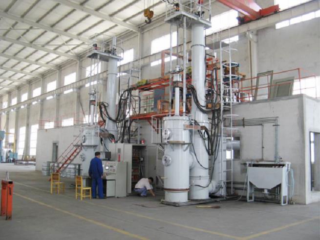 Vacuum consumable electric arc furnace: it releases high temperature heat energy to melt the titanium electrode through solitary light discharge under a certain vacuum condition, and avoids burning in the high temperature titanium atmosphere, forming titanium liquid drops, which fall into the strong water-cooled crucible and solidify into ingots, with an annual output of 750t.